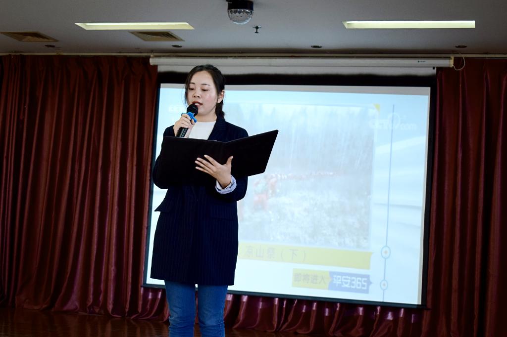 第三环节为学习模范。由韦红雪老师为大家讲述了3月30日凉山森林火灾救火英雄的先进事迹,而后又播放了他们英勇救火的视频。救火英雄们冲锋在前、不畏牺牲的精神深深震撼、感动、净化了在场师生的心灵。