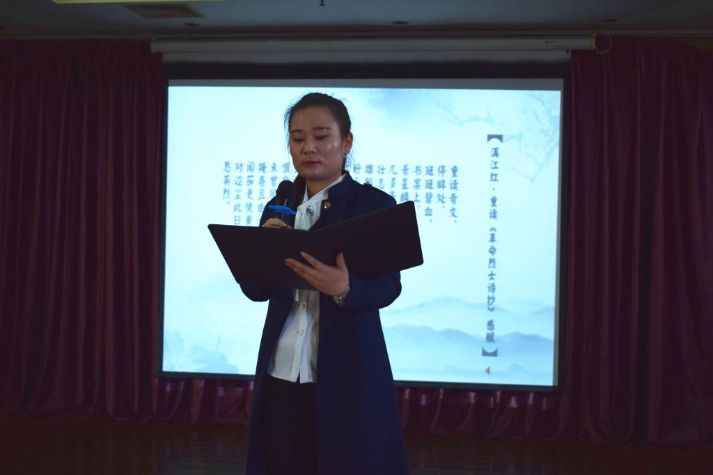 第二环节为诵读经典。“重读奇文,停眸处,斑斑碧血。书案上,景星麟凤,几多豪杰。壮志常随云浪起,雄躯争与山河裂。好头颅换取九州同,心如铁。……对边尘此日又嚣嚣,思英烈。”冯彩华老师带领大家饱含感情地诵读了《满江红·重读<革命烈士诗抄>感赋》,深刻体会到了革命先烈们胸怀祖国、壮志凌云、不怕牺牲、无私无畏的铮铮铁骨和浩然正气。