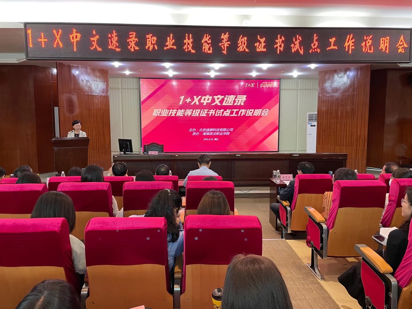 为深入贯彻落实国务院《国家职业教育改革实施方案》和教育部、国家发展改革委、财政部、市场监管总局联合印发的《关于在院校实施“学历证书+若干职业技能等级证书”制度试点方案》,促进相关院校和企业对1+X职业技能等级证书(下称1+X证书)标准的了解,4月10日,由海南政法职业学院和北京速录科技有限公司联合举办的1+X中文速录职业技能等级证书试点工作说明会在海口市举行。来自全国18个省区市、41所职业院校和相关机构共68人出席了说明会。澳门网投官网副院长殷宏、检察系副主任郭月霞和教务科科长时瑞燕参加了此次会议。