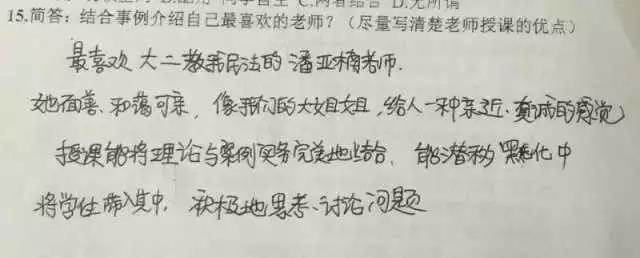 潘:我能说这是自带的效果吗?我觉得在讲台上不止要有严肃的一面,更多的可以把学生当作民法爱好者一样去用心交流,用轻松的语言举一些有趣的事例,多用启发性的设问,和学生轻松的互动。课堂偶尔聊一些关于社会、就业、恋爱的话题,其实也是在于给学生正面的引导。关注学生要求,教学资源师生共享,尽心帮助学生答疑解惑。备课、上课、回复学生的各种问题是我的工作常态。老师发自内心地爱学生,才有了学生对老师的信赖,老师的威信才会逐步确立。
